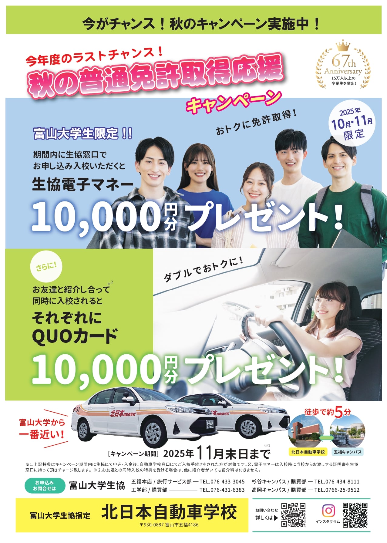 View Larger Image 【富山大学生限定】「秋の普通免許取得キャンペーン」実施中!期間中に生協でお申込 みされ、ご入校頂いた富大生の方には、生協電子マネー10,000 円分プレゼント!! キャンペーン期間:10 月~11 月末日まで 富山大学生限定で「秋の普通免許取得キャンペーン」を10月~11月末までの期間で実施します。 期間中に生協で普通免許をお申込みされ、ご入校頂くと、もれなく「生協電子マネー10,000 円分」をプレゼントします。 そして更に、お友達と同時に入校され紹介しあえば「QUO カード 10,000 円分」をそれぞれにプレゼントします。 お得がいっぱいのこのキャンペーン中にぜひご入校ください。お待ちしております!! サイト開発者2025-09-29T14:17:57+09:002025年9月29日|お知らせ|