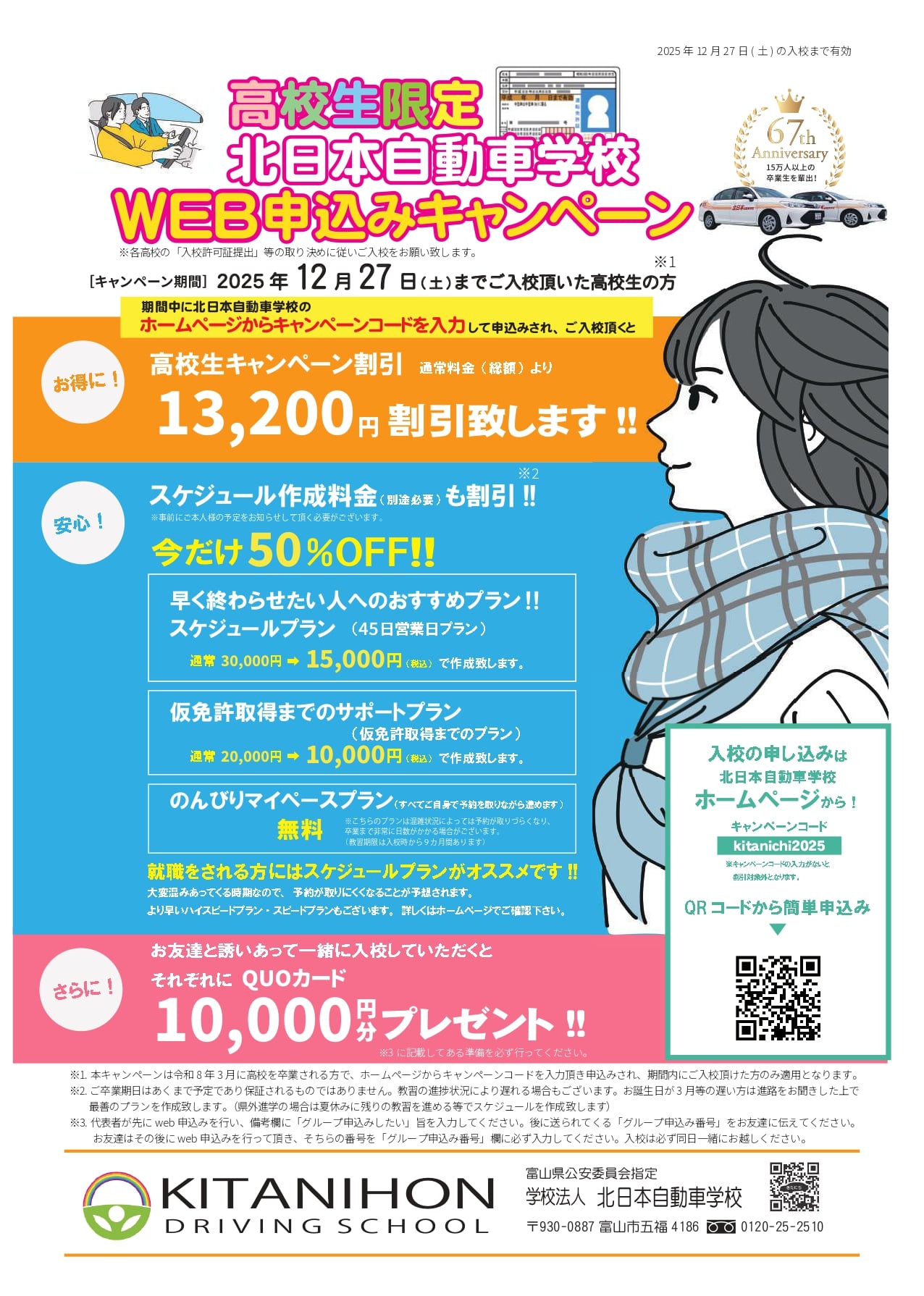 「高校生割引」や就職等の進路に間に合わせたい方への「スケジュールプラン料金 50%OFF」、さらにお友達と同日にご入校頂いて紹介しあえば、それぞれに QUO カード 10,000 円分もプレゼント致します。